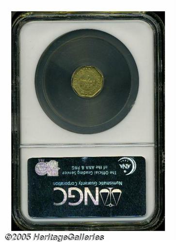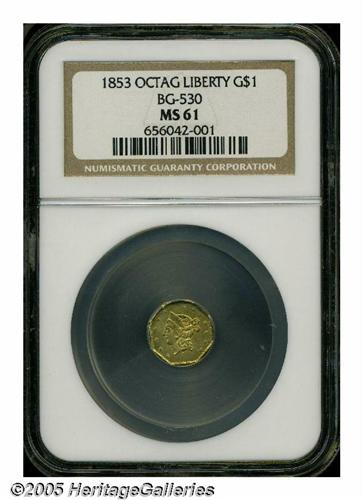 <B>1853<$1> Liberty Octagonal 1 Dollar, BG-530, R.2, MS61 NGC.</B></I> A well struck honey-gold piece with hints of ocean-blue color on the upper obverse. A lightly marked Period One Gold Dollar.
