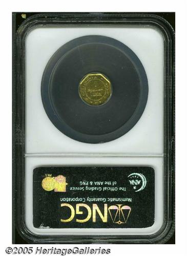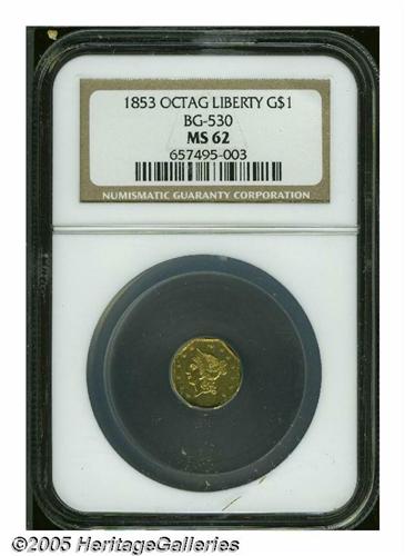 <B>1853<$1> Liberty Octagonal 1 Dollar, BG-530, R.2, MS62 NGC.</B></I> Reddish-gold surfaces display adequately struck design elements. Handling marks are noted over each side, particularly on the reverse. What appears to be a couple of strike-throughs are visible in the right reverse field.