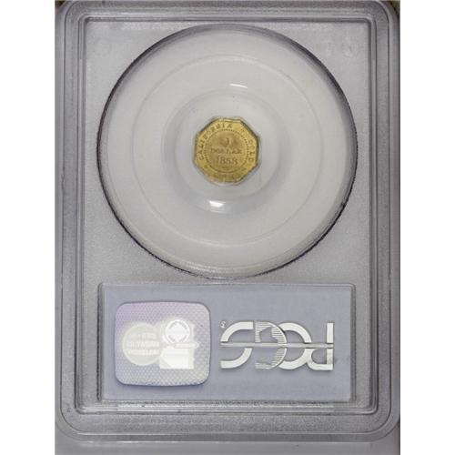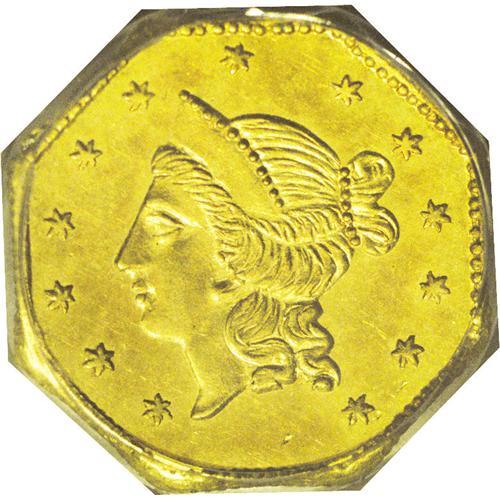 <B>1853<$1> Liberty Octagonal 1 Dollar, BG-531, R.4, MS62 PCGS.</B></I> A needle-sharp piece that reveals honey and yellow-gold colors when it is rotated under a light. Hints of green are visible on both sides. The obverse field has a few trivial hairlines that define the grade. Two examples of this variety were recovered among treasure from the <I>S.S. Winfield Scott,</B></I> which sunk in December 1853, thus confirming that these coins were struck in that year, and that they did circulate as money. Clearly finer than the AU58 Jay Roe specimen, sold in September 2003 for $863.