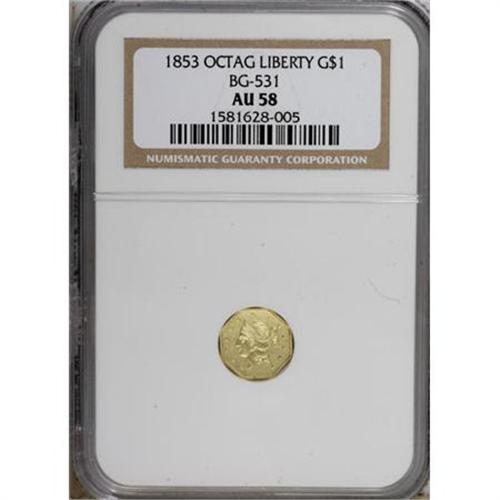 <B>1853 $1 Liberty Octagonal 1 Dollar, BG-531, R.4, AU58 NGC.</B></I> This Period One octagonal dollar displays substantial luster, particularly across the portrait. The pale green-gold fields exhibit minor marks from brief non-numismatic handling.<BR><BR><b>Shipping:</b> Coins & Currency (<a target="_blank" href="http://www.heritageauctions.com/common/shipping.php">view shipping information</a>)