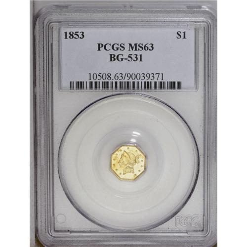 <B>1853<$1> Liberty Octagonal 1 Dollar, BG-531, R.4, MS63 PCGS.</B></I> A flashy honey-gold example that possesses an occasional blush of deeper peach color. Exquisitely struck throughout, and the moderately reflective fields exhibit only the infrequent trivial slide mark. A desirable Period One octagonal dollar, made during an era when such pieces were used in West Coast commerce. Population: 4 in 63, 0 finer (2/06).