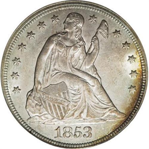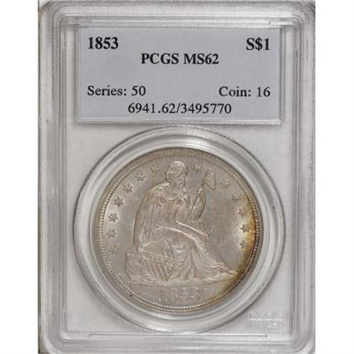 <B>1853 $1 MS62 PCGS.</B></I> Whispers of golden-brown patina visit the right obverse margin of this MS62 specimen, and sparkling luster resides at the borders and on the motifs. A well executed strike brings out nice definition on the design features. Minute marks are scattered over each side.<BR><BR><B>Coin Engraver:</B> Christian Gobrecht<BR><BR><b>Shipping:</b> Coins & Currency (<a target="_blank" href="http://www.heritageauctions.com/common/shipping.php">view shipping information</a>)