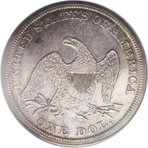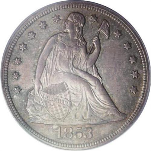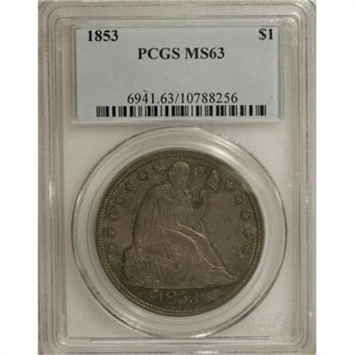 <B>1853 $1 MS63 PCGS.</B></I> This Select Mint State example offers lovely orange-gold toning over steel-gray surfaces, with a sharp strike and fewer signs of contact than might be expected for the grade. It is perhaps only the slightly subdued luster that keeps this piece from a finer grade. The 1853 weight reduction in minor silver coinage did not apply to the silver dollar, whether by commission or omission, and because they were worth more as bullion than as coins, examples failed to circulate. Population: 25 in 63, 10 finer (7/07).<BR><BR><B>Coin Engraver:</B> Christian Gobrecht<BR><BR><b>Shipping:</b> Coins & Currency (<a target="_blank" href="http://www.heritageauctions.com/common/shipping.php">view shipping information</a>\)