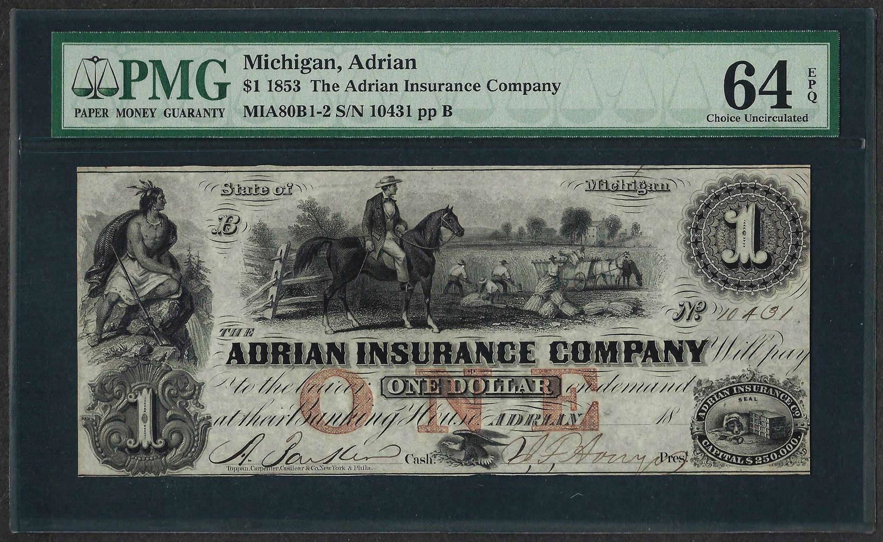 One 1853 $1 The Adrian Insurance Company Obsolete Note PMG Choice Uncirculated 64EPQ. PMG Certified.