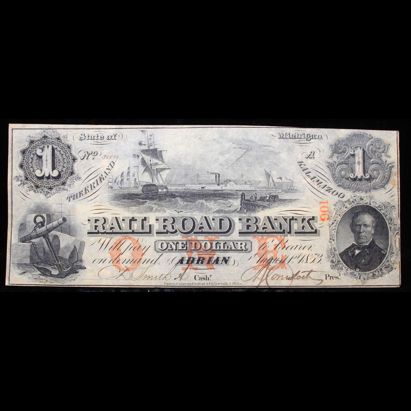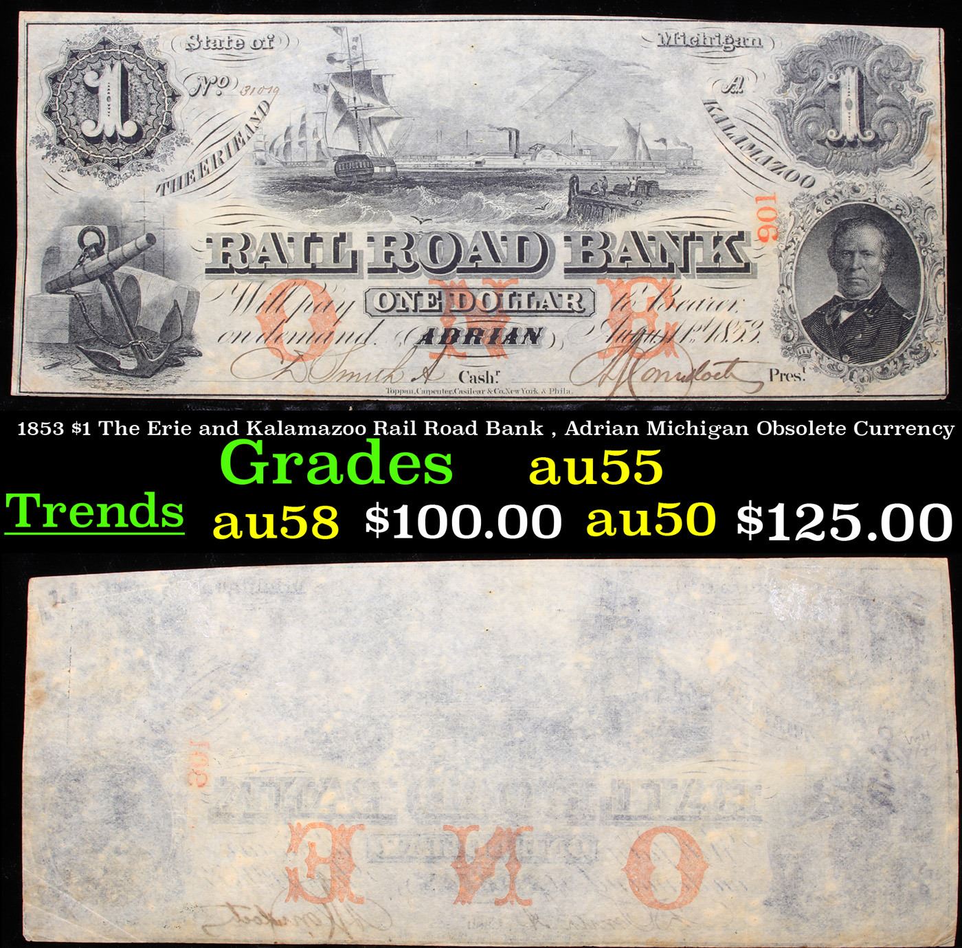 1853 $1 The Erie and Kalamazoo Rail Road Bank , Adrian Michigan Obsolete Currency Grades Choice AU