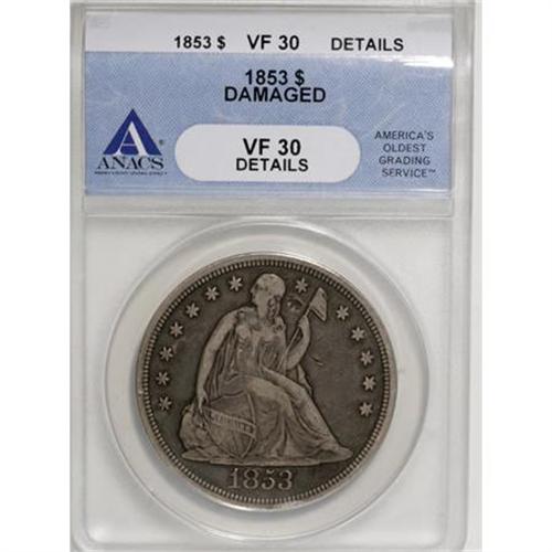 <B>1853 $1 --Damaged--ANACS. VF30 Details.</B></I> NGC Census: (0/122). PCGS Population (3/153). Mintage: 46,110. Numismedia Wsl. Price for NGC/PCGS coin in VF30: $515. (#6941)<BR><BR><B>Coin Engraver:</B> Christian Gobrecht<BR><BR><b>Shipping:</b> Coins & Currency (<a target="_blank" href="http://www.heritageauctions.com/common/shipping.php">view shipping information</a>)