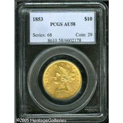<B>1853 $10 AU58 PCGS.</B></I> Intricately struck for the type, this bagmark-free example is clean aside from a few wispy slide marks near the arrow heads. Although the 1853 is not rare by No Motto standards, most survivors of the issue are clearly circulated, and do not possess the remaining luster of the present piece. Population: 14 in 58, 22 finer (1/05). Lot:8745