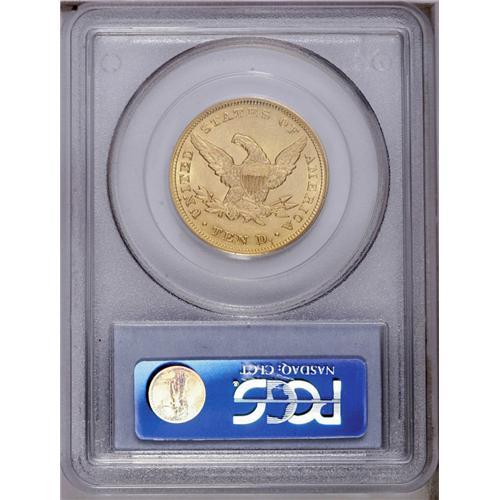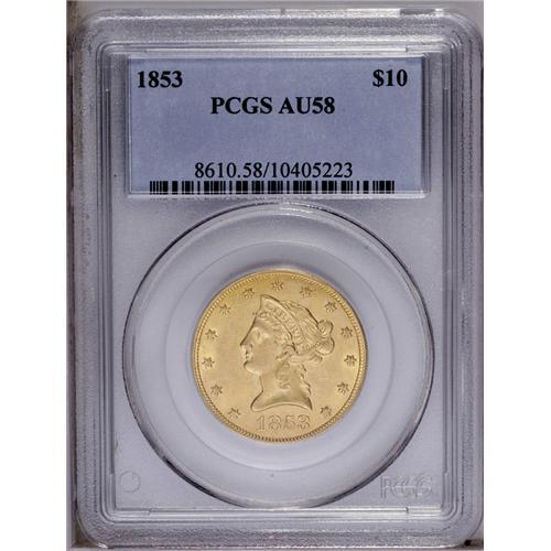 <B>1853<$10> AU58 PCGS.</B></I> Yellow-gold patination displays subtle traces of light green. The design features are well impressed, except for softness in the hair above Liberty's ear. Wispy slide marks are evident over both sides. Population: 16 in 58, 23 finer (3/06). <BR><BR><B>Important notice:</B> Heritage usually auctions material at the rate of 200-250 lots per hour. On some occasions eBay Live bid software or the Internet may not be able to keep up with the pace of the auction. We recommend placing a realistic absentee bid now as insurance to avoid disappointment. Occasionally the auctioneer may eliminate or reject an eBay Live bid, and the auctioneer may also reopen a lot after the close of the eBay live bidding (usually because we missed an audience bid), and may reject your bid even if it shows you as the winning bidder. By bidding via eBay Live, you agree that Heritage may award the lot to another bidder at its sole discretion under the circumstances described above or any other reasonable circumstances. Since eBay bids are not shown to us until we open the lot on the floor, we treat those bids just like floor bids. In most cases the floor responds before the eBay bid is presented to us, due to Internet lag time, so for consistency we have made it a policy that floor bids are always considered first over tie eBay live bids. Also please note that all Heritage lots purchased through eBay Live carry a 20% Buyer's Premium. Please make sure you read the Terms and Conditions before you bid. This lot is being auctioned in conjunction with a live floor auction by Heritage Galleries & Auctioneers. All final auction and invoice information will be supplied by Heritage Galleries & Auctioneers, and all other information should be considered preliminary. Lot:3935 <BR><BR><B>Winning Notification and Billing:</B> After the FINAL session in this auction is complete, Heritage will send e-mail and snail mail invoices. This process normally takes several days. All final auction and invoice information will be supplied by Heritage Galleries & Auctioneers, and all other information should be considered preliminary. <BR><BR>This auction will be conducted on a live auction floor and over the Internet through eBay Live. If you choose to place an absentee bid, please take a moment to <font color='#0000ff'><u><a href='http://pages.ebay.com/liveauctions/help/before/laabsentee.html'>learn how eBay Live absentee bidding works</a></u></font><font color='#000000'>