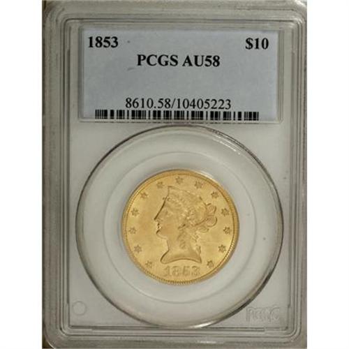 <B>1853 $10 AU58 PCGS.</B></I> Delicate green-gold accents visit the otherwise yellow-gold surfaces of this near-Mint eagle. The design features are solidly struck save for a hint of softness at the hair above Liberty's ear. Minor friction and light abrasions, but highly appealing nonetheless. Population: 18 in 58, 26 finer (12/07).<BR><BR><B>Coin Engraver:</B> Christian Gobrecht<BR><BR><b>Shipping:</b> Coins & Currency (<a target="_blank" href="http://www.heritageauctions.com/common/shipping.php">view shipping information</a>)