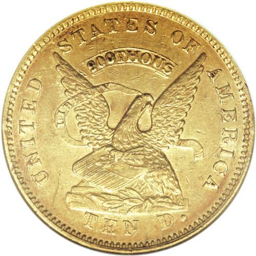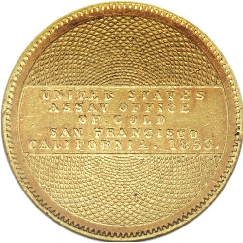 <B>1853 $10 Assay Office Ten Dollar, 900 Thous. MS60 NGC.</B></I> K-16, Low R.6. The later U.S. Assay Office pieces with 900 THOUS rather than 884 THOUS were an effort by the producers to avoid trouble with Federal authorities over coins that were less than the minimum required fineness specified by the 1837 Mint Act governing gold coinage. The pieces were all struck between March and April 1853. This piece shows fully lustrous surfaces on each side, with greenish-gold color (as Kagin notes for the variety). There are many minuscule abrasions noted under a loupe, but no major ones and none that are individually significant. Census: 2 in 60, 4 finer (4/07).<BR><BR><b>Shipping:</b> Coins & Currency (<a target="_blank" href="http://www.heritageauctions.com/common/shipping.php">view shipping information</a>)