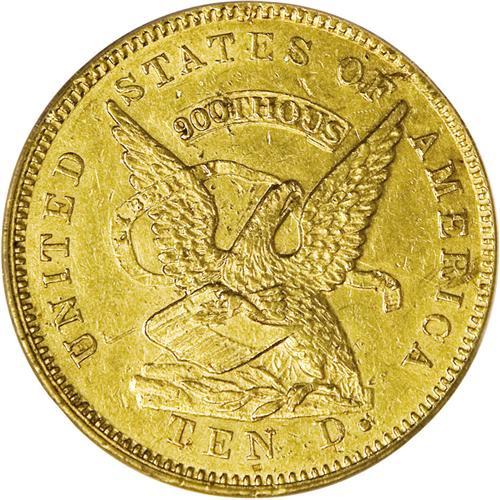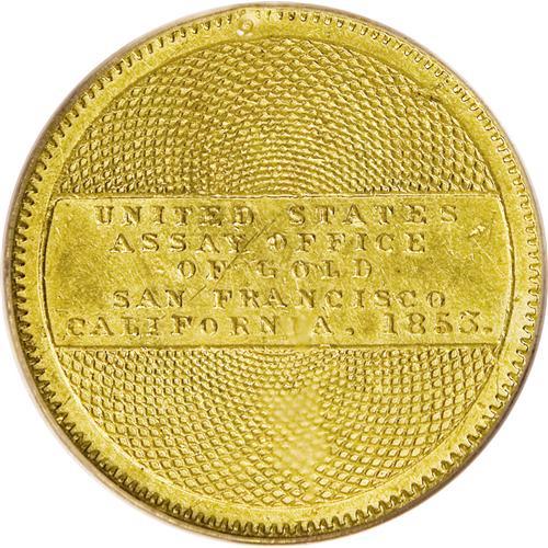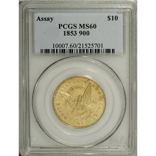<B>1853 $10 Assay Office Ten Dollar, 900 Thous. MS60 PCGS.</B></I> K-16, Low R.6. The Mint Act of Jan. 18, 1837, stated that all U.S. gold coins had to be of .900 fineness, with no more than 50 parts silver per thousand, and the remainder copper. Congress condemned earlier U.S. Assay Office pieces of lesser fineness as unfit for custom duties. Although considered and collected as a Territorial gold issue, the U.S. Assay Office of Gold pieces, struck in March-April 1853, are actually issued under the authority of the U.S. government, an expedient until the San Francisco Mint could be opened in 1854. This piece offers brilliant, full luster over greenish-gold surfaces, with moderate abrasions and a couple of pinscrapes on the obverse.<BR><BR><b>Shipping:</b> Coins & Currency (<a target="_blank" href="http://www.heritageauctions.com/common/shipping.php">view shipping information</a>)