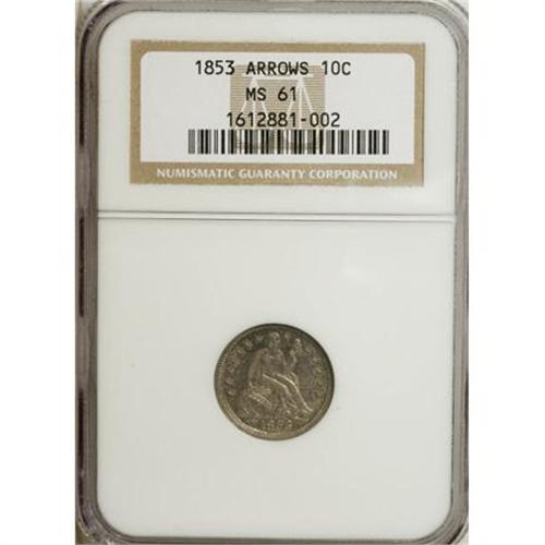 <B>1853 10C Arrows MS61 NGC.</B></I> NGC Census: (32/458). PCGS Population (11/399). Mintage: 12,078,010. Numismedia Wsl. Price for NGC/PCGS coin in MS61: $333. (#4603)<BR><BR><b>Shipping:</b> Coins & Currency (<a target="_blank" href="http://www.heritageauctions.com/common/shipping.php">view shipping information</a>)