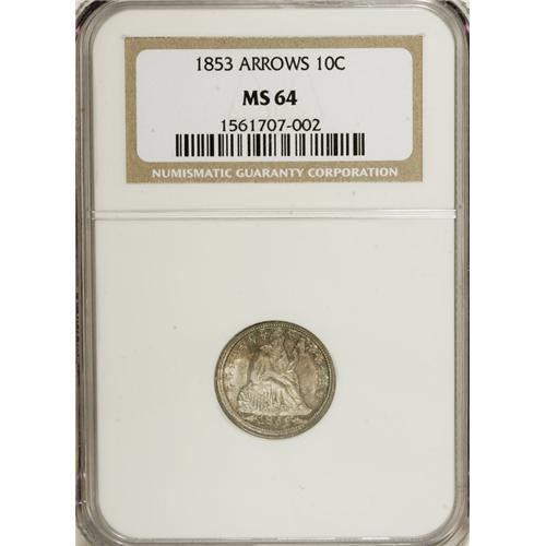 <B>1853 10C Arrows MS64 NGC.</B></I> Deep aqua, olive, and smoke-gray patina visits each side of this attractive near-Gem coin, without dampening the considerable luster present. A well struck example of this available and popular type.<BR><I>Ex: Stack's 71st Anniversary Sale (10/2006), lot 2663.</B></I><BR><BR><b>Shipping:</b> Coins & Currency (<a target="_blank" href="http://www.heritageauctions.com/common/shipping.php">view shipping information</a>)