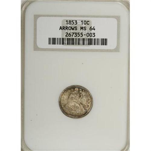 <B>1853 10C Arrows MS64 NGC.</B></I> Both sides display an attractive coating of mottled olive, rose, and lilac patina which is clearly original. Boldly struck, if typically soft on the top of Liberty's head, with satiny luster and moderate clash marks on the reverse, beneath ME in DIME. Some shallow pinscratches are noted in the obverse field to the left of stars 11 and 12. In an earlier generation NGC holder.<BR><I>From The Arnold & Harriet Collection, Part Two.</B></I><BR><BR><B>Coin Engraver:</B> Christian Gobrecht<BR><BR><b>Shipping:</b> Coins & Currency (<a target="_blank" href="http://www.heritageauctions.com/common/shipping.php">view shipping information</a>)