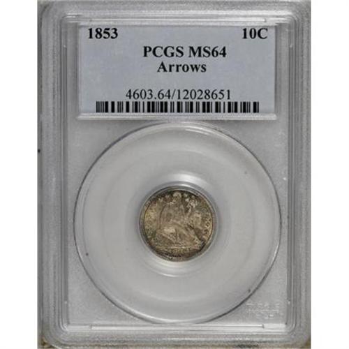 <B>1853 10C Arrows MS64 PCGS.</B></I> Though the central devices are a trifle soft, this lovely Arrows piece is well struck overall and displays elegant violet and gold-orange patina on each side. Soft, pleasing luster shines beneath on this pleasing type coin.<BR><BR><B>Coin Engraver:</B> Christian Gobrecht<BR><BR><b>Shipping:</b> Coins & Currency (<a target="_blank" href="http://www.heritageauctions.com/common/shipping.php">view shipping information</a>)