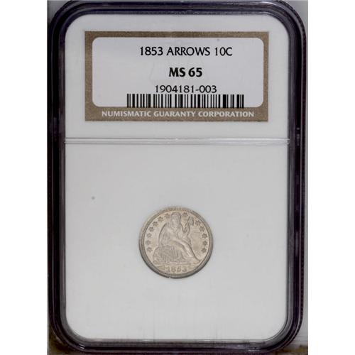 <B>1853<10C> Arrows MS65 NGC.</B></I> Pewter-gray on both sides with well defined striking characteristics and softly lustrous surfaces. The surface integrity is as one would expect from a Gem, with no marks that are easily seen without a loupe.