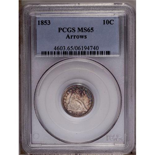 1853 10C Arrows MS65 PCGS. Electric-blue, golden-brown 1853[10C] Arrows MS65 PCGS.