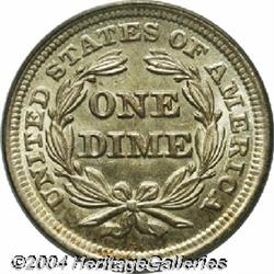 <B>1853<10C> Arrows MS65 PCGS.</B></I> A bright Gem example of this popular, short-lived type coin. The satiny, lustrous surfaces are virtually mark-free and highlighted with touches of light silver-gray and golden color. <BR><BR><B>Important notice:</B> Heritage usually auctions material at the rate of 200-250 lots per hour. On some occasions eBay Live bid software or the Internet may not be able to keep up with the pace of the auction. We recommend placing a realistic absentee bid now as insurance to avoid disappointment. Occasionally the auctioneer may eliminate or reject an eBay Live bid, and the auctioneer may also reopen a lot after the close of the eBay live bidding (usually because we missed an audience bid), and may reject your bid even if it shows you as the winning bidder. By bidding via eBay Live, you agree that Heritage may award the lot to another bidder at its sole discretion under the circumstances described above or any other reasonable circumstances. Since eBay bids are not shown to us until we open the lot on the floor, we treat those bids just like floor bids. In most cases the floor responds before the eBay bid is presented to us, due to Internet lag time, so for consistency we have made it a policy that floor bids are always considered first over tie eBay live bids. Also please note that all Heritage lots purchased through eBay Live carry a 20% Buyer's Premium. Please make sure you read the Terms and Conditions before you bid.