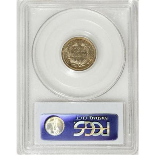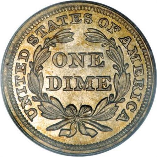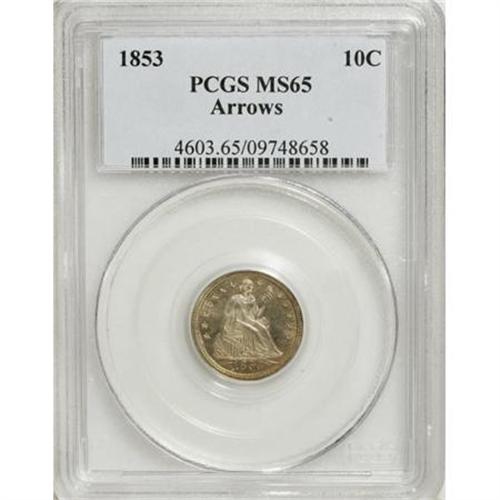<B>1853 10C Arrows MS65 PCGS.</B></I> Fortin-121. Gerry Fortin has enumerated approximately 40 varieties of 1853 With Arrows Seated dimes on his subscription-based website, www.seateddimevarieties.com. Nearly all of these varieties are individually illustrated. While the F-121 variety is not particularly rare, this piece may be the finest known. Identification of the obverse is immediately evident, as the right arrow stem is lightly joined to the upper right curve of the 3. Actually, the stem and upper rear edge of the right arrow is recut, and it is the recutting of the stem that contacts the 3 in the date.<BR> This light golden beauty is an amazing Gem, with light clash marks in the obverse and reverse fields, but no evidence of die cracks on either side. The fields on both sides are fully mirrored, although not deeply so. The contrast is sufficient to provide a delightful cameo appearance. The coin is sharply struck, with every detail showing remarkable depth and completeness.<BR><BR><B>Coin Engraver:</B> Christian Gobrecht<BR><BR><b>Shipping:</b> Coins & Currency (<a target="_blank" href="http://www.heritageauctions.com/common/shipping.php">view shipping information</a>)