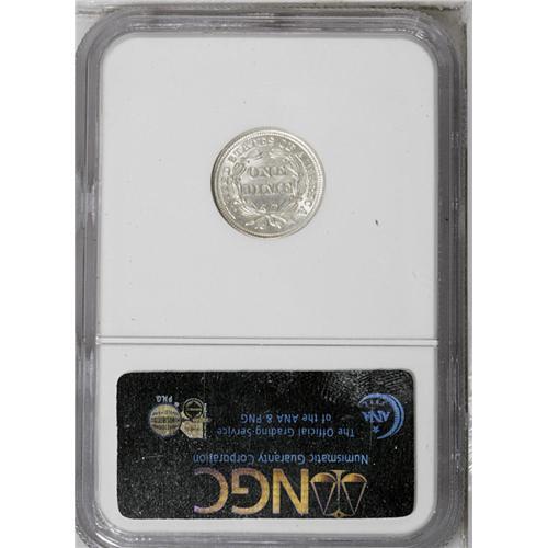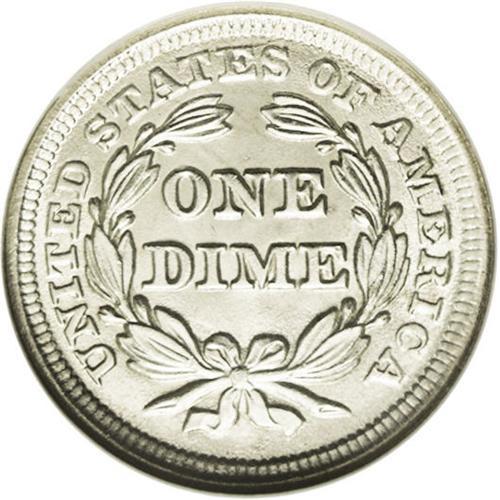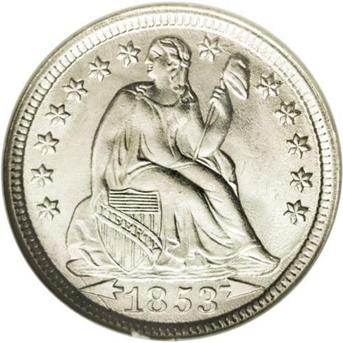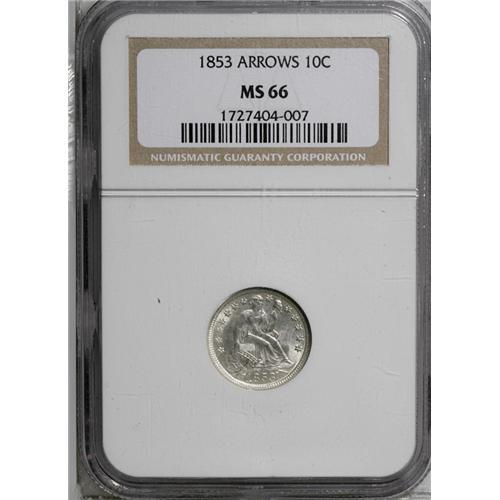 <B>1853<10C> Arrows MS66 NGC.</B></I> After the weight of subsidiary silver coinage was reduced in February 1853, it was necessary to rapidly replenish the dwindling supply of old-tenor silver coins that were leaving circulation. More than 12 million dimes were struck. While that is a vast number, Gem and better examples are seldom seen, as most of the mintage entered circulation. This beautiful, snow-white example has soft, frosted surfaces and a couple of minor luster grazes in the right obverse field. A light obverse die crack passes from star 7 through the head and Liberty cap, and a second crack passes from the rim through the left arrow to the rock base. An outstanding example of this short-lived type coin. Census: 38 in 66, 9 finer (7/06).