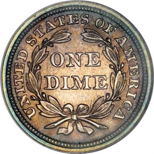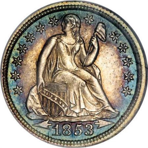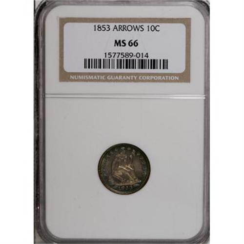 <B>1853 10C Arrows MS66 NGC.</B></I> After the discovery of large amounts of gold in California, the price of silver rose in relation to gold to the point that silver coinage no longer circulated. The result was a Congressional act that slightly lowered the amount of silver in minor silver coins. To distinguish these pieces, Mint Director Eckert had arrowheads placed on each side of the date. These short-lived type coins have been eagerly sought after by collectors for generations. This is a splendid, high grade example that is sharply struck on each side. The satiny mint luster is nearly brilliant in the center of the obverse with rings of deep rose and sea-green at the margin. The reverse is mostly rose colored throughout. Census: 41 in 66, 12 finer (11/07).<BR><I>From The Madison Collection.</B></I><BR><BR><B>Coin Engraver:</B> Christian Gobrecht<BR><BR><b>Shipping:</b> Coins & Currency (<a target="_blank" href="http://www.heritageauctions.com/common/shipping.php">view shipping information</a>)