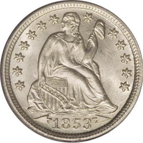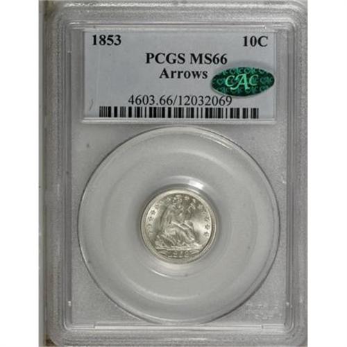 <B>1853 10C Arrows MS66 PCGS. CAC.</B></I> Brilliant and highly lustrous, with an intense cartwheel sheen in the fields, this is a splendid Premium Gem example of the immensely popular 1853 Arrows dime. The design elements are crisply struck, with a spindly die crack extending around the obverse periphery and through the stars, and moderate die clash marks in the obverse fields. The weight of silver coinage was reduced in this year, and arrows were placed beside the date in order to identify the new, lighter coins. Population: 38 in 66, 17 finer (12/07). <BR><BR><B>Coin Engraver:</B> Christian Gobrecht<BR><BR><b>Shipping:</b> Coins & Currency (<a target="_blank" href="http://www.heritageauctions.com/common/shipping.php">view shipping information</a>)