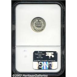 1853 10C Arrows MS68 NGC. The Mint Act of February 21, 1853 reduced the weight of the Seated Dime from 2.67 grams to 2.49 grams to discourage hoarding. The Philadelphia Mint delivered a staggering (for the era) total of 12 million 1853-dated Dimes at the new weight standard, each with arrows flanking the date to denote the change. Most of these coins entered circulation, where they replaced their heavier predecessors that had been withdrawn and melted. Although common in worn grades, the 1853 Arrows is very elusive at the finer Mint State levels of preservation, particularly when compared to the number of high grade type collectors in today's hobby. A truly exquisite representative of this popular, short-lived, three-year type. Scintillating bright luster blankets the completely untoned surfaces. The fields impart a partially reflective finish due to the numerous die striations present (as struck), and we cannot locate a single distracting blemish as would be expected of the assigned grade. Clashmarks are seen in the fields on each side but do not detract in any way. Fully struck with eye appeal to spare. Population: 4 in 68, 1 finer (11/03). Important notice: Heritage usually auctions material at the rate of 200-250 lots per hour. On some occasions eBay Live bid software or the Internet may not be able to keep up with the pace of the auction. We recommend placing a realistic absentee bid now as insurance to avoid disappointment. Occasionally the auctioneer may eliminate or reject an eBay Live bid, and the auctioneer may also reopen a lot after the close of the eBay live bidding (usually because we missed an audience bid), and may reject your bid even if it shows you as the winning bidder. By bidding via eBay Live, you agree that Heritage may award the lot to another bidder at its sole discretion under the circumstances described above or any other reasonable circumstances. Also please note that all Heritage lots purchased through eBay Live carry a 20% Buyer's Premium. Please make sure you read the Terms and Conditions before you bid.