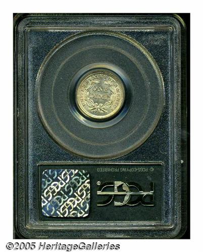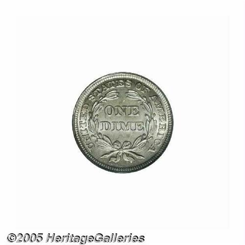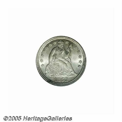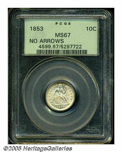 <B>1853<10C> No Arrows MS67 PCGS.</B></I> Before the Act of February 21, 1853 authorized the weight reduction of the dime from 2.67 grams to 2.48 grams, and the addition of arrows to either side of the date to indicate the reduction, a mere 95,000 dimes were issued from the Philadelphia mint. This variety is scarce in all grades, and, although it is occasionally seen in lower mint state grades, Superb Gem examples are certainly few and far between. The example offered here possesses lustrous silver-gray surfaces visited by light champagne patina. The design features are well impressed throughout, including good detail on Liberty's head and sandal. A couple of trivial, unobtrusive marks on Liberty's shoulder and breasts are mentioned for accuracy. Population: 4 in 67, 4 finer (6/05).