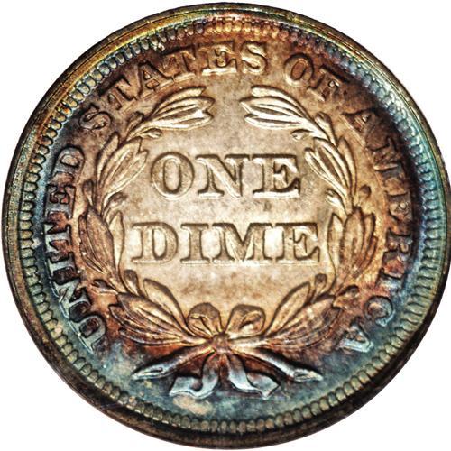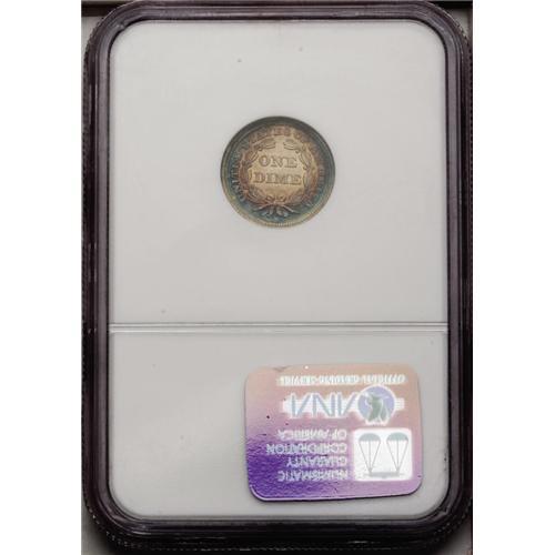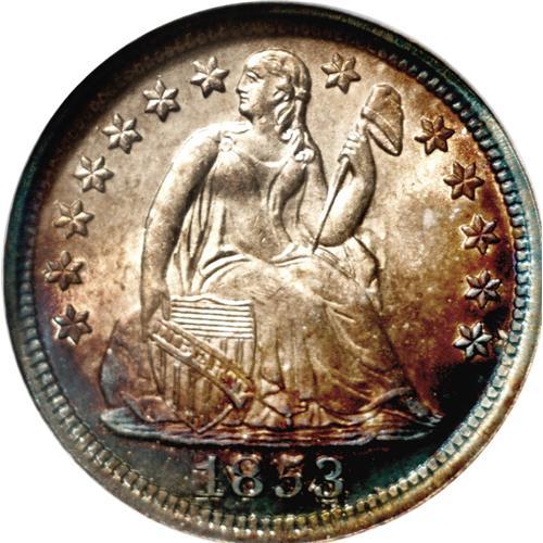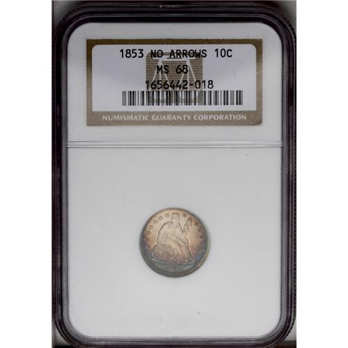 <B>1853<10C> No Arrows MS68 NGC.</B></I> Fortin-101a. Die clashing of the E of DIME onto the obverse die between Liberty's left (right facing) arm and the drapery; and on the reverse, die defects on the lower right serif of E of ONE and on the upper middle upright of the E of DIME. Actually, a later die state which Fortin did not list, as obverse clash marks from the reverse wreath are either very faint or do not show.<BR> The 1853 No Arrows dime, with a mintage of 95,000 business strikes, consisted of two deliveries: February 17, 1853 (55,000 pieces) and February 19 (40,000 pieces). Immediately after its production, the Mint Act of February 21, 1853, reduced the weight of the dime from 2.67 grams to 2.48 grams, proportionately with other coins through the half dollar. This was due to an increase in the price of silver that resulted from the immense discoveries of gold in California. The high silver price made it profitable to melt silver coins of the old weight standard, and they began to disappear from circulation. To distinguish the lower weight silver coinage, arrows were added to each side of the date (in addition, rays were added to the reverse of the quarter and half dollar in 1853).<BR> The 1853 No Arrows dime is scarce in all grades, largely resulting from it being heavily melted. According to Walter Breen in his <I>Complete Encyclopedia of U.S. and Colonial Coins:</B></I> "Mint State survivors mostly come from a batch (small hoard?) rescued by Harold P. Newlin before 1883." Still, Uncirculated examples, especially in the higher grades, appear infrequently on the market. Of the 130 or so Mint State specimens certified by NGC and PCGS, fewer than 30 have graded Premium Gem or better, some of these undoubtedly being resubmissions. A mere seven specimens have attained the MS68 grade level at both services combined, with none finer.<BR> The MS68 coin offered in this lot possesses outstanding luster that is complemented by medium intensity patination of cobalt-blue arou