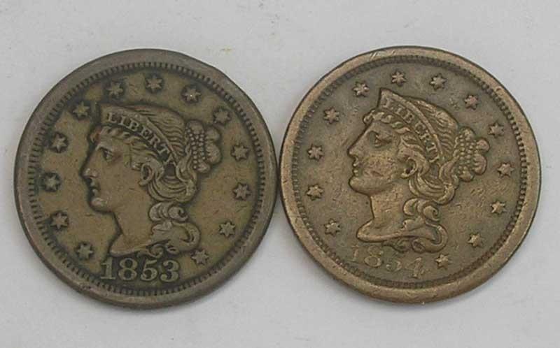 1853 & 1854 Large Cent Pair - vf grade- Actual items in photo-