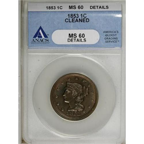 <B>1853 1C Brown--Cleaned--ANACS. MS60 Details.</B></I> NGC Census: (1/750). PCGS Population (8/424). Mintage: 6,641,131. Numismedia Wsl. Price for NGC/PCGS coin in MS60: $130. (#1901)<BR><BR><B>Coin Engraver:</B> Christian Gobrecht<BR><BR><b>Shipping:</b> Coins & Currency (<a target="_blank" href="http://www.heritageauctions.com/common/shipping.php">view shipping information</a>)