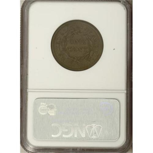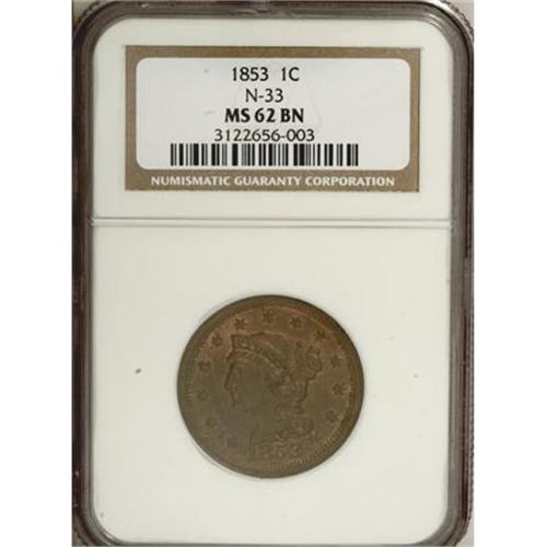 <B>1853 1C MS62 Brown NGC.</B></I> N-33. NGC Census: (105/609). PCGS Population (38/381). Mintage: 6,641,131. Numismedia Wsl. Price for NGC/PCGS coin in MS62: $175. (#1901)<BR><BR><B>Coin Engraver:</B> Christian Gobrecht<BR><BR><b>Shipping:</b> Coins & Currency (<a target="_blank" href="http://www.heritageauctions.com/common/shipping.php">view shipping information</a>)