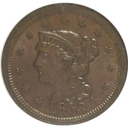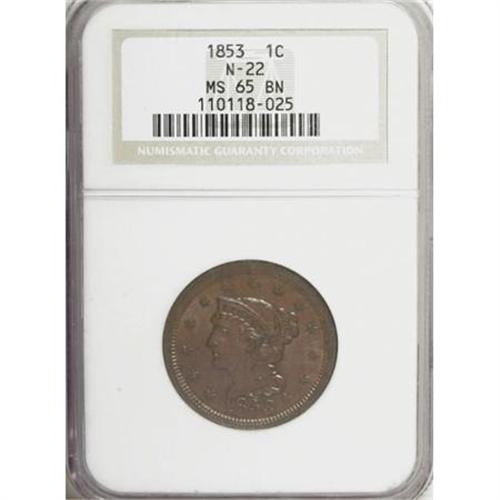 <B>1853 1C MS65 Brown NGC.</B></I> N-22. NGC Census: (183/77). PCGS Population (66/11). Mintage: 6,641,131. Numismedia Wsl. Price for NGC/PCGS coin in MS65: $625. (#1901)<BR><BR><B>Coin Engraver:</B> Christian Gobrecht<BR><BR><b>Shipping:</b> Coins & Currency (<a target="_blank" href="http://www.heritageauctions.com/common/shipping.php">view shipping information</a>)
