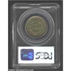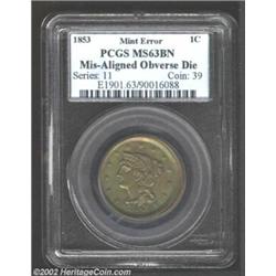 1853 1C Cent--Mis-Aligned Obverse Die--MS63 Brown PCGS. N-19. Strong repunching on the 3 in the date is the most readily evident diagnostic of this die marriage--a feature that is discernible to the naked eye and especially clear under a loupe. The reverse of this Cent is well centered on the planchet with bold, if not sharp definition over all features. The obverse die, on the other hand, was not aligned properly with the result that the impression is off center a few degrees to the left. There is an extra lip of flan along the right border on that side, and the crisp striking detail on Liberty's portrait gives way to softness on some of the peripheral stars. Both sides are richly toned in antique-gold and medium brown shades, there are some shallow planchet voids (as struck) in the center of the reverse around the denomination ONE CENT. Important notice: We expect to be auctioning lots at the rate of 200-250 per hour. Sometimes eBay Premier live bid software cannot keep up with that pace, so we strongly recommend that you place a realistic proxy bid now as insurance to avoid disappointment. Also please note that all Heritage/CAA lots purchased through eBay Premier carry a 20% Buyer's Premium. Please make sure you read the Terms and Conditions.