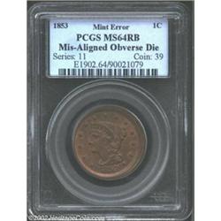 1853 1C Cent--Mis-Aligned Obverse Die--MS64 Red and Brown PCGS. At first glance, the obverse appears