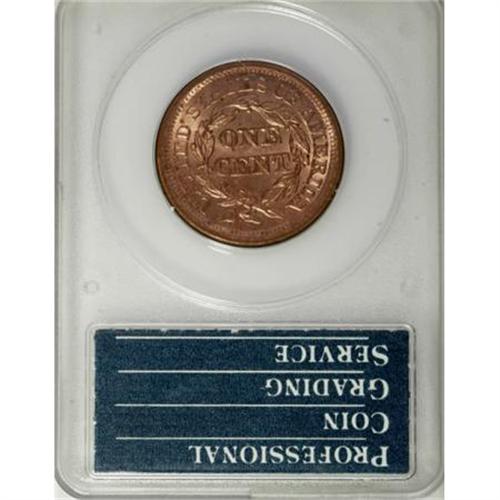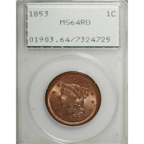 <B>1853 1C MS64 Red PCGS.</B></I> Full cherry-red color is noted on both sides of this near-Gem. A few tiny spots are noted including a bit of verdigris above the E in STATES on the reverse. Free of abrasions and well-struck, with tremendous eye appeal and color. Housed in a first-generation PCGS holder. EAC 65.<BR><BR><B>Coin Engraver:</B> Christian Gobrecht<BR><BR><b>Shipping:</b> Coins & Currency (<a target="_blank" href="http://www.heritageauctions.com/common/shipping.php">view shipping information</a>)