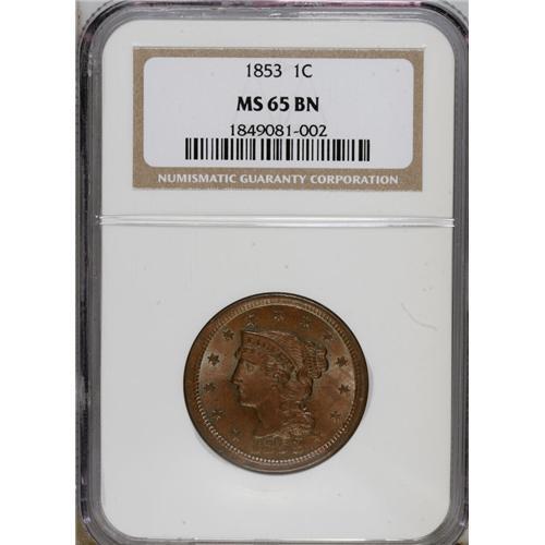 <B>1853 1C MS65 Brown NGC.</B></I> NGC Census: (179/77). PCGS Population (64/0). Mintage: 6,641,131. Numismedia Wsl. Price for NGC/PCGS coin in MS65: $625. (#1901)<BR><BR><b>Shipping:</b> Coins & Currency (<a target="_blank" href="http://www.heritageauctions.com/common/shipping.php">view shipping information</a>)