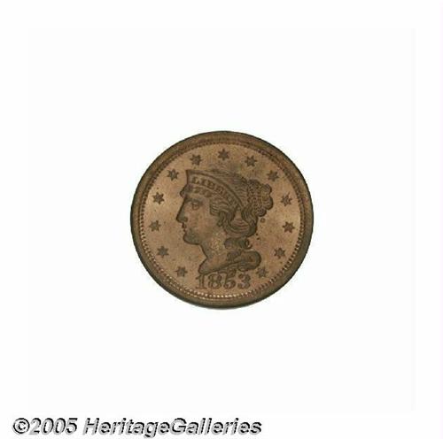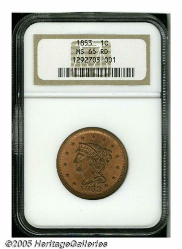 <B>1853<1C> MS65 Red NGC.</B></I> N-10, R.1. A gorgeous brick-red Gem, well struck on the major devices while some of the stars are typically delivered by the dies. Recutting is noted on the date, particularly the upper loop of the 8. Nearly unabraded, and only inconsequential carbon is present. Shallow strike-throughs, as made and usual for the type, are on the neck and near the T in CENT. Population: 44 in 65, 12 finer (6/05).