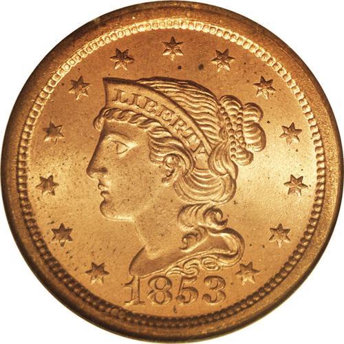 <B>1853<1C> MS65 Red NGC.</B></I> N-10, R.1. Die State B. Lovely orange-gold color and potent cartwheel luster provide imposing eye appeal. Well struck aside from a couple of star centrils. A handling mark on the 18 in the date and a few miniscule carbon flecks preclude a finer grade. Census: 43 in 65, 12 finer (3/06). EAC 65. <BR><BR><B>Important notice:</B> Heritage usually auctions material at the rate of 200-250 lots per hour. On some occasions eBay Live bid software or the Internet may not be able to keep up with the pace of the auction. We recommend placing a realistic absentee bid now as insurance to avoid disappointment. Occasionally the auctioneer may eliminate or reject an eBay Live bid, and the auctioneer may also reopen a lot after the close of the eBay live bidding (usually because we missed an audience bid), and may reject your bid even if it shows you as the winning bidder. By bidding via eBay Live, you agree that Heritage may award the lot to another bidder at its sole discretion under the circumstances described above or any other reasonable circumstances. Since eBay bids are not shown to us until we open the lot on the floor, we treat those bids just like floor bids. In most cases the floor responds before the eBay bid is presented to us, due to Internet lag time, so for consistency we have made it a policy that floor bids are always considered first over tie eBay live bids. Also please note that all Heritage lots purchased through eBay Live carry a 20% Buyer's Premium. Please make sure you read the Terms and Conditions before you bid. This lot is being auctioned in conjunction with a live floor auction by Heritage Galleries & Auctioneers. All final auction and invoice information will be supplied by Heritage Galleries & Auctioneers, and all other information should be considered preliminary. Lot:330 <BR><BR><B>Winning Notification and Billing:</B> After the FINAL session in this auction is complete, Heritage will send e-mail and snail mail invoices. This process normally takes several days. All final auction and invoice information will be supplied by Heritage Galleries & Auctioneers, and all other information should be considered preliminary. <BR><BR>This auction will be conducted on a live auction floor and over the Internet through eBay Live. If you choose to place an absentee bid, please take a moment to <font color='#0000ff'><u><a href='http://pages.ebay.com/liveauctions/help/before/laabsentee.html'>learn how eBay Live absentee bidding works</a></u></font><font color='#000000'>