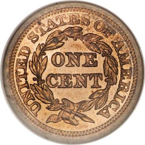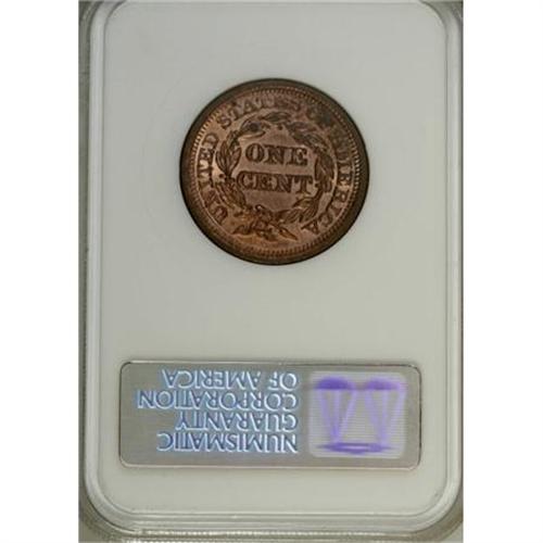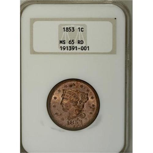 <B>1853 1C MS65 Red NGC.</B></I> N-25, R.1. Grellman Die State b. This brick-red Gem has booming luster and no noticeable marks. The portrait is well struck, while the stars are generally soft. Distributed minor carbon is consistent with the grade. Certified in a prior generation holder. EAC 64.<BR><BR><B>Coin Engraver:</B> Christian Gobrecht<BR><BR><b>Shipping:</b> Coins & Currency (<a target="_blank" href="http://www.heritageauctions.com/common/shipping.php">view shipping information</a>)