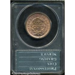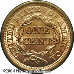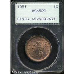 1853 1C MS65 Red PCGS. N-25, R.1. Die State B. A l <B>1853 1C MS65 Red PCGS.</B></I> N-25, R.1. Die State B. A lustrous brick-red Gem that is well struck in the centers and has only modest softness of definition on the peripheral elements. Virtually devoid of contact, a trace of carbon is occasionally present, however, bright gold color dominates, especially on the reverse. A prize for the Mature Head collector. Encapsulated in a first generation, small-sized PCGS holder. Population: 54 in 65, 14 finer (11/04). <BR><BR><B>Important notice:</B> Heritage usually auctions material at the rate of 200-250 lots per hour. On some occasions eBay Live bid software or the Internet may not be able to keep up with the pace of the auction. We recommend placing a realistic absentee bid now as insurance to avoid disappointment. Occasionally the auctioneer may eliminate or reject an eBay Live bid, and the auctioneer may also reopen a lot after the close of the eBay live bidding (usually because we missed an audience bid), and may reject your bid even if it shows you as the winning bidder. By bidding via eBay Live, you agree that Heritage may award the lot to another bidder at its sole discretion under the circumstances described above or any other reasonable circumstances. Since eBay bids are not shown to us until we open the lot on the floor, we treat those bids just like floor bids. In most cases the floor responds before the eBay bid is presented to us, due to Internet lag time, so for consistency we have made it a policy that floor bids are always considered first over tie eBay live bids. Also please note that all Heritage lots purchased through eBay Live carry a 20% Buyer's Premium. Please make sure you read the Terms and Conditions before you bid. This lot is being auctioned in conjunction with a live floor auction by Heritage Galleries & Auctioneers. All final auction and invoice information will be supplied by Heritage Galleries & Auctioneers, and all other information should be considered preliminary. Lot:5053