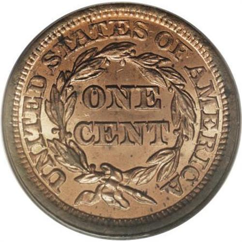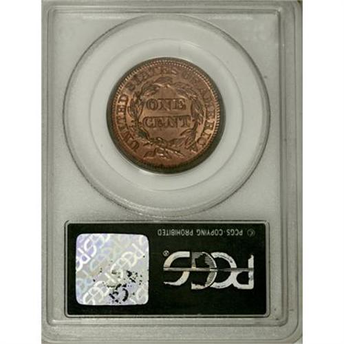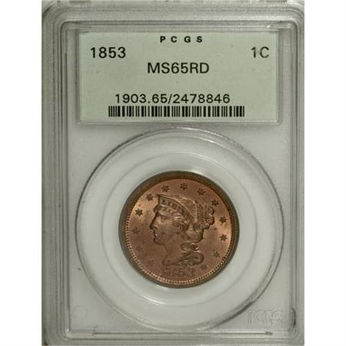 <B>1853 1C MS65 Red PCGS.</B></I> N-25, R.1. Grellman Die State b. This lustrous fire-red representative is essentially unabraded, and the strike is precise aside from a few star centers. Distributed minor carbon denies a higher grade. Certified in an old green label holder. Population: 57 in 65 Red, 14 finer (6/07).<BR><BR><B>Coin Engraver:</B> Christian Gobrecht<BR><BR><b>Shipping:</b> Coins & Currency (<a target="_blank" href="http://www.heritageauctions.com/common/shipping.php">view shipping information</a>\)