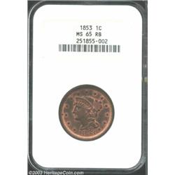 <TR><TD width="100%"><TABLE cellSpacing=1 cellPadding=3 width="100%" border=0><TBODY><TR><TD width="100%" bgColor=#79735c><FONT face=arial color=#ffffff size=3><B>Description</B> </FONT></TD></TR><TR><TD width="100%" bgColor=#ffffff><FONT face=arial size=2><B>1853 1C MS65 Red and Brown NGC.</B></I> N-25, R.1. The base of the 1 and 3 in the date are lightly recut. Both sides have considerable crimson color, while the cheek, neck, and exposed fields have mellowed chocolate-brown patina. Sharply struck aside from a few stars. The obverse border has a small toning spot at 9 o'clock. </FONT></TD></TR></TBODY></TABLE></TD></TR></TBODY></TABLE><BR><A name=PricesRealized></A><TABLE cellSpacing=0 cellPadding=0 width="100%" bgColor=#000000 border=0><TBODY><TR><TD width="100%"><TABLE cellSpacing=1 cellPadding=3 width="100%" border=0><TBODY><TR><TD width="100%" bgColor=#79735c><A name=PR><FONT face=arial color=#ffffff size=3><B>Previous Prices from Heritage Auctions</B> </FONT></A></TD></TR><TR><TD bgColor=#f6f6ed><TABLE cellSpacing=0 cellPadding=0 width="100%" border=1><TBODY><TR><TD align=middle width="33%"><B>Date</B></TD><TD align=middle width="33%"><B>Service</B></TD><TD align=middle width="33%"><B>Price</B></TD></TR><TR bgColor=whitesmoke><TD width="33%"><B>11/23/2002</B></TD><TD width="33%">PCGS</TD><TD width="33%">$552.00</TD></TR><TR bgColor=whitesmoke><TD width="33%"><B>06/08/2002</B></TD><TD width="33%">PCGS</TD><TD width="33%">$690.00</TD></TR><TR bgColor=whitesmoke><TD width="33%"><B>10/06/2000</B></TD><TD width="33%">PCGS</TD><TD width="33%">$632.50</TD></TR><TR bgColor=whitesmoke><TD width="33%"><B>12/31/2002</B></TD><TD width="33%">NGC</TD><TD width="33%">$664.70</TD></TR><TR bgColor=whitesmoke><TD width="33%"><B>07/30/2002</B></TD><TD width="33%">NGC</TD><TD width="33%">$546.25</TD></TR><TR bgColor=whitesmoke><TD width="33%"><B>07/30/2002</B></TD><TD width="33%">NGC</TD><TD width="33%">$546.25</TD></TR><TR bgColor=whitesmoke><TD width="33%"><B>08/08/2001</B></TD><TD width="33%">NGC</TD><TD width="33%">$603.75</TD></TR><TR bgColor=whitesmoke><TD width="33%"><B>06/04/1993</B></TD><TD width="33%">NGC</TD><TD width="33%">$671.00</TD></TR><TR bgColor=whitesmoke><TD width="33%"><B>03/16/1996</B></TD><TD width="33%">ANACS</TD><TD width="33%">$467.50</TD></TR></TBODY></TABLE></TD></TR><TR><TD bgColor=#ffffff><FONT face=arial size=1 ?>PLEASE NOTE: All prices realized reflect the final hammer price PLUS the buyer's premium in auctions that charge a buyer's premium. Each item has a notation at the top of the listing indicating whether that lot included a buyer's premium. Example: A item that sells with a final hammer price of $100 and a 20% buyer's premium will display with a price realized of $120. All information listed is intended to be as accurate as possible, but errors are possible. Please use this guide carefully and inform us of any inaccuracies. </FONT></TD></TR></TBODY></TABLE></TD></TR></TBODY></TABLE><BR><TABLE cellSpacing=0 cellPadding=0 width="100%" bgColor=#000000 border=0><TBODY><TR><TD width="100%"><TABLE cellSpacing=1 cellPadding=3 width="100%" border=0><TBODY><TR><TD width="100%" bgColor=#79735c colSpan=6><FONT face=arial color=#ffffff size=3><B>Price Guide*</B> </FONT></TD></TR><TR bgColor=#f6f6ed><TD align=middle><B>Grade</B> </TD><TD align=middle><B>Coin World<BR>(Trends)</B> </TD><TD align=middle><B>Numismedia<BR>Retail</B> </TD><TD align=middle><B>Numismedia<BR>Wholesale</B> </TD><TD align=middle><B>Coin<BR>Universe</B> </TD><TD align=middle><B>Heritage<BR>Value Index</B> </TD></TR><TR bgColor=#ffffff><TD align=middle>64</TD><TD align=right>$500.00</TD><TD align=right>$531.00</TD><TD align=right>$425.00</TD><TD align=right>$475.00</TD><TD align=right>$332.25</TD></TR><TR style="FONT-WEIGHT: bold" bgColor=#cccfdd><TD align=middle>65</TD><TD align=right>---</TD><TD align=right>$840.00</TD><TD align=right>$675.00</TD><TD align=right>$1,150.00</TD><TD align=right>$693.33</TD></TR><TR bgColor=#ffffff><TD align=middle>66</TD><TD align=right>---</TD><TD align=right>---</TD><TD align=right>$1,250.00</TD><TD align=right>$2,000.00</TD><TD align=right>$1,400.00</TD></TR><TR bgColor=#ffffff><TD colSpan=6><FONT size=1>*All information listed is intended to be as accurate as possible, but errors are possible. No item may be returned or refused based on this information which is provided as a service to our customers. You should contact each pricing source directly to determine the accuracy of this information. </FONT></TD></TR></TBODY></TABLE></TD></TR></TBODY></TABLE><BR><TABLE cellSpacing=0 cellPadding=0 width="100%" bgColor=#000000 border=0><TBODY><TR><TD width="100%"><TABLE cellSpacing=1 cellPadding=3 width="100%" border=0><TBODY><TR><TD width="100%" bgColor=#79735c><FONT face=arial color=#ffffff size=3><B>Population Guide</B> </FONT></TD></TR><TR bgColor=#ffffff><TD align=middle><!-- Begin Output of Population Grid--><TABLE cellSpacing=0 cellPadding=0 width="100%" border=0><TBODY><TR><TD vAlign=center><TABLE cellSpacing=0 width="100%" border=1 cellsadding="3"><TBODY><TR><TD vAlign=center><TABLE cellSpacing=0 cellPadding=3 width="100%" border=1><TBODY><TR><TD vAlign=center align=middle bgColor=#f0f1e8 colSpan=2 <CENTER><FONT face=Arial size=2><B>PCGS Pop </B></FONT><CENTER></CENTER></TD><TD vAlign=center align=middle bgColor=#f0f1e8 colSpan=2><CENTER><FONT face=Arial size=2><B>NGC Pop</B></CENTER></FONT></TD></TR><TR><TD vAlign=center><FONT face=Arial size=2>(65)</FONT> </TD><TD vAlign=center align=right><FONT face=Arial size=2>66</FONT> </TD><TD vAlign=center><FONT face=Arial size=2>(65)</FONT> </TD><TD vAlign=center align=right><FONT face=Arial size=2>99</FONT> </TD></TR><TR><TD vAlign=center><FONT face=Arial size=2>(>65)</FONT> </TD><TD vAlign=center align=right><FONT face=Arial size=2>1</FONT> </TD><TD vAlign=center><FONT face=Arial size=2>(>65)</FONT> </TD><TD vAlign=center align=right><FONT face=Arial size=2>33</FONT> </TD></TR></TBODY></TABLE></TD></TR></TBODY></TABLE></TD