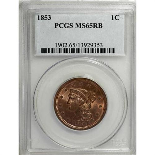 <B>1853 1C MS65 Red and Brown PCGS.</B></I> N-10, R.1. This hoard coin displays pretty copper-gold luster and a wisp or two of light tan. Sharply struck, and free of mentionable contacts or unsightly spotting. Population: 77 in 65 Red and Brown, 4 finer (12/07). EAC 64.<BR><BR><B>Coin Engraver:</B> Christian Gobrecht<BR><BR><b>Shipping:</b> Coins & Currency (<a target="_blank" href="http://www.heritageauctions.com/common/shipping.php">view shipping information</a>)