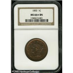 <B>1853 1C MS66 <img border='0' src='http://www.heritagecoins.com/images/star.gif' width=10 height=10> Brown NGC.</B></I> N-18, R.1. This is nearly a Red and Brown example with exquisite surfaces and 15 to 20% original orange mint luster. A wonderful Gem that will suit the date or type collector. Lot:5161