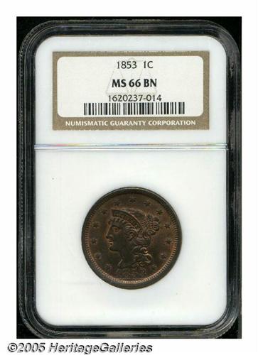 <B>1853<1C> MS66 Brown NGC.</B></I> N-25, R.1. The obverse of this coin will surprise many because approximately 30%-40% of that side retains the original mint red color. The remainder of that side and almost all of the reverse, though, are deep brown. Sharply defined in the centers with the usual weakness around the margins. Entirely free of marks. Population: 64 in 66 Brown, 6 finer in Brown (3/05).