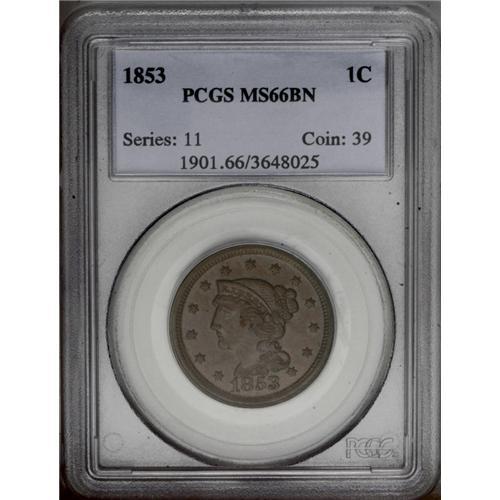 <B>1853<1C> MS66 Brown PCGS.</B></I> N-18, R.1. Die State b. A short dash beneath the 8 in the date is still visible in this intermediate die state. This is a frosty medium brown example with fully lustrous surfaces and tinges of mint red on the reverse. Although not a census level coin, this is an attractive Mint State cent. EAC 60. <BR><BR><B>Important notice:</B> Heritage usually auctions material at the rate of 200-250 lots per hour. On some occasions eBay Live bid software or the Internet may not be able to keep up with the pace of the auction. We recommend placing a realistic absentee bid now as insurance to avoid disappointment. Occasionally the auctioneer may eliminate or reject an eBay Live bid, and the auctioneer may also reopen a lot after the close of the eBay live bidding (usually because we missed an audience bid), and may reject your bid even if it shows you as the winning bidder. By bidding via eBay Live, you agree that Heritage may award the lot to another bidder at its sole discretion under the circumstances described above or any other reasonable circumstances. Since eBay bids are not shown to us until we open the lot on the floor, we treat those bids just like floor bids. In most cases the floor responds before the eBay bid is presented to us, due to Internet lag time, so for consistency we have made it a policy that floor bids are always considered first over tie eBay live bids. Also please note that all Heritage lots purchased through eBay Live carry a 20% Buyer's Premium. Please make sure you read the Terms and Conditions before you bid. This lot is being auctioned in conjunction with a live floor auction by Heritage Galleries & Auctioneers. All final auction and invoice information will be supplied by Heritage Galleries & Auctioneers, and all other information should be considered preliminary. Lot:327 <BR><BR><B>Winning Notification and Billing:</B> After the FINAL session in this auction is complete, Heritage will send e-mail and snail mail invoices. This process normally takes several days. All final auction and invoice information will be supplied by Heritage Galleries & Auctioneers, and all other information should be considered preliminary. <BR><BR>This auction will be conducted on a live auction floor and over the Internet through eBay Live. If you choose to place an absentee bid, please take a moment to <font color='#0000ff'><u><a href='http://pages.ebay.com/liveauctions/help/before/laabsentee.html'>learn how eBay Live absentee bidding works</a></u></font><font color='#000000'>