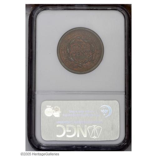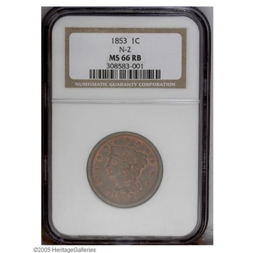 <B>1853<1C> MS66 Red and Brown NGC.</B></I> N-2, R.1. The well preserved surfaces are about equally divided between brown and gleaming red coloration. Fully struck except for minor weakness on a few of the right side denticles, on each side of the coin. An attractive Premium Gem. Population: 34 in 66 Red and Brown, 1 finer in Red and Brown (9/05).