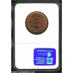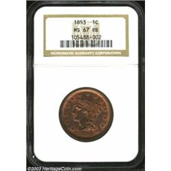 1853 1C MS67 Red and Brown NGC. A boldly struck example that has luminous crimson color across the stars and wreath and within the hair tresses. Portions of the portrait and field have mellowed in rich lavender hues. Seemingly pristine, and also free from the spots that are often seen on Red and Brown Large Cents. As no 1853 Cents have been certified above MS66 Red by NGC, and this is the only MS67 Red and Brown Cent graded by NGC, this Superb Gem is thus the finest NGC graded 1853 Cent. Important notice: We expect to be auctioning lots at the rate of 200-250 per hour. On occasion eBay live bid software cannot keep up with the pace of the auctions where 4-5 lots per minute can hammer down, so we recommend that you place a realistic absentee bid now as insurance to avoid disappointment. Also please note that all Heritage/CAA lots purchased through eBay Live carry a 20% Buyer's Premium. Please make sure you read the Terms and Conditions.