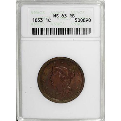 <B>1853 1C MS63 Red and Brown ANACS.</B></I> NGC Census: (38/292). PCGS Population (72/266). Mintage: 6,641,131. Numismedia Wsl. Price for NGC/PCGS coin in MS63: $292. (#1902)<BR><BR><B>Coin Engraver:</B> Christian Gobrecht<BR><BR><b>Shipping:</b> Coins & Currency (<a target="_blank" href="http://www.heritageauctions.com/common/shipping.php">view shipping information</a>)